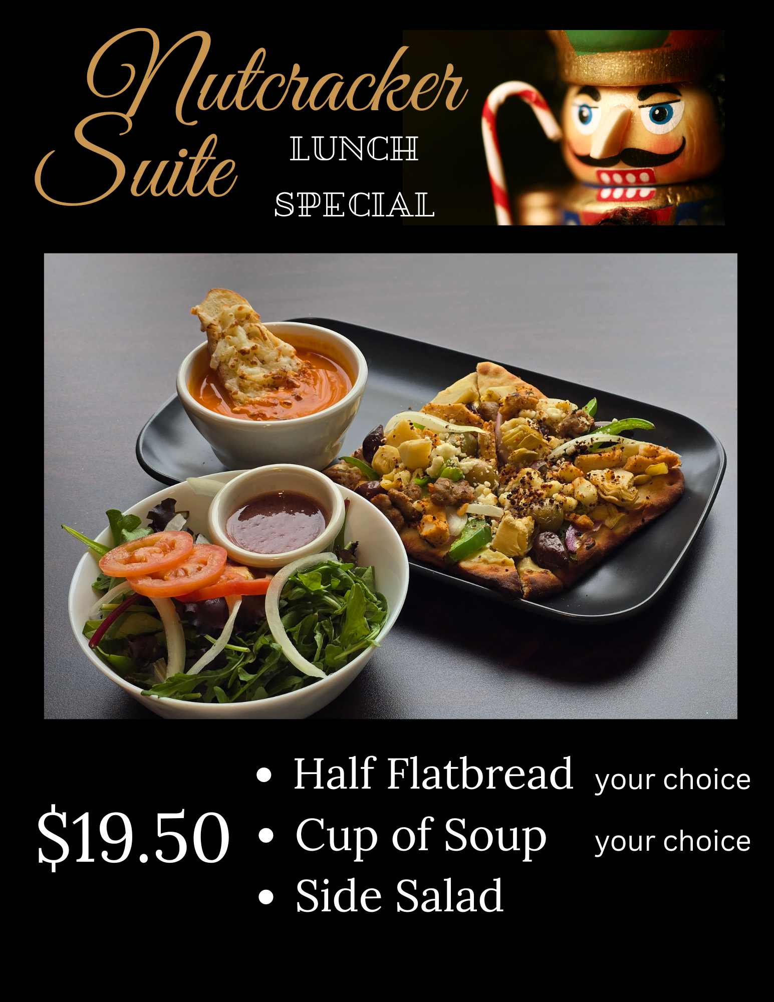 LUNCH SPECIAL!! Enjoy your choice of a half-sized flatbread, paired perfectly with a cup of soup and a fresh side salad, all for just $19.50. Available Tuesday-Sunday from 12pm-3pm.